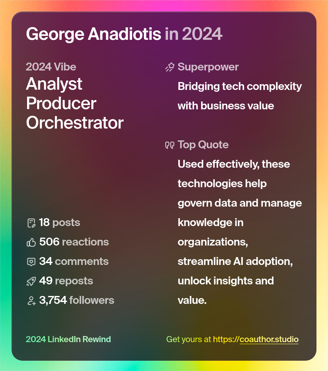 And yes, as my 2024 LinkedIn Rewind quote goes, used effectively, these technologies help govern data and manage knowledge in organizations, streamline Al adoption, unlock insights and value. I had my fair share of exploring this hands-on, diving into Graph RAG and working on the open source Connected Data Knowledge Graph project.